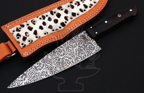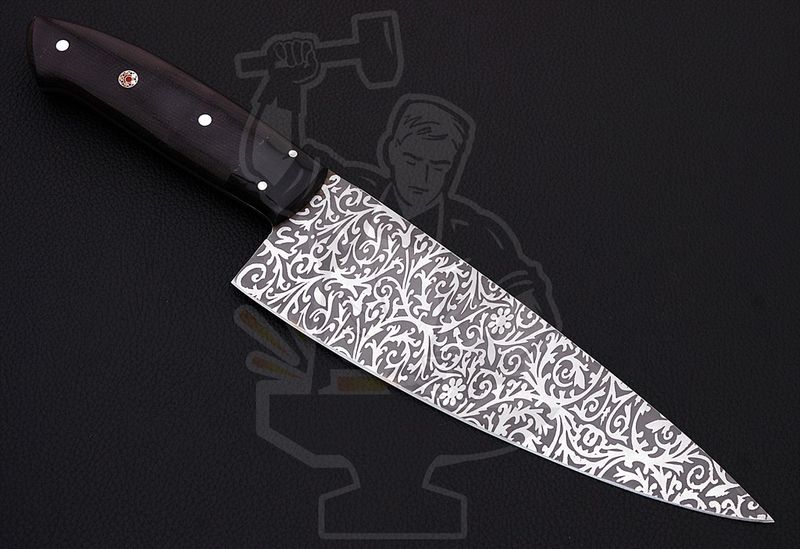 Carbon Steel knivesCarbon Chef Knife (etched) — Carbon Steel knives. ENGRAVED (ETCHED) CARBON STEEL BLADE (NOT DAMASCUS)- Overall Length: 11.75″ • Blade Length: 7.10″ • Blade Thickness: 2mm