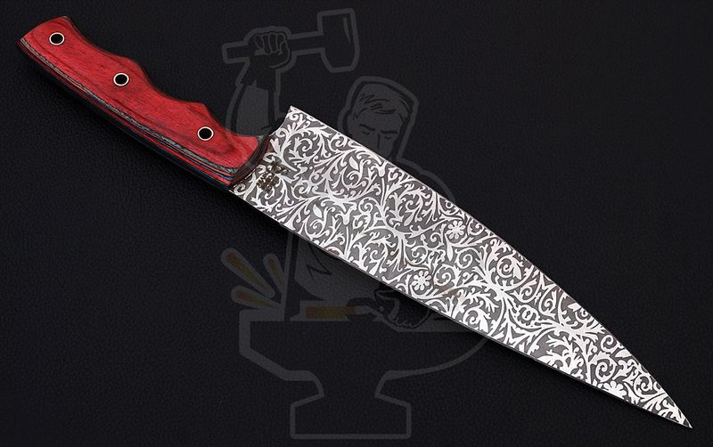 Carbon Steel knivesCarbon Chef Knife (etched) — Carbon Steel knives. ENGRAVED (ETCHED) CARBON STEEL BLADE (NOT DAMASCUS)- Overall Length: 13″ • Blade Length: 8.25″ • Blade Thickness: 2mm