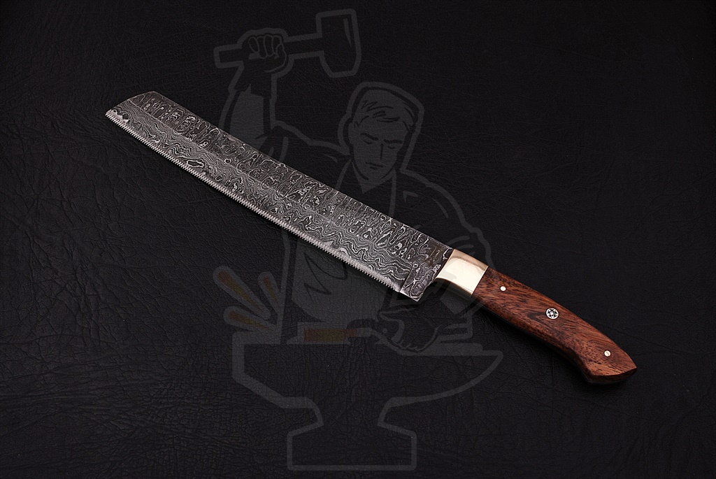 Damascus Chef/Kitchen knivesDamascus Bread Knife — Damascus Chef/Kitchen knives. Damascus steel Blade Bread knife- Overall Length: 14″ • Blade Length: 9.25″ • Blade Hardness: 56-58 HRC