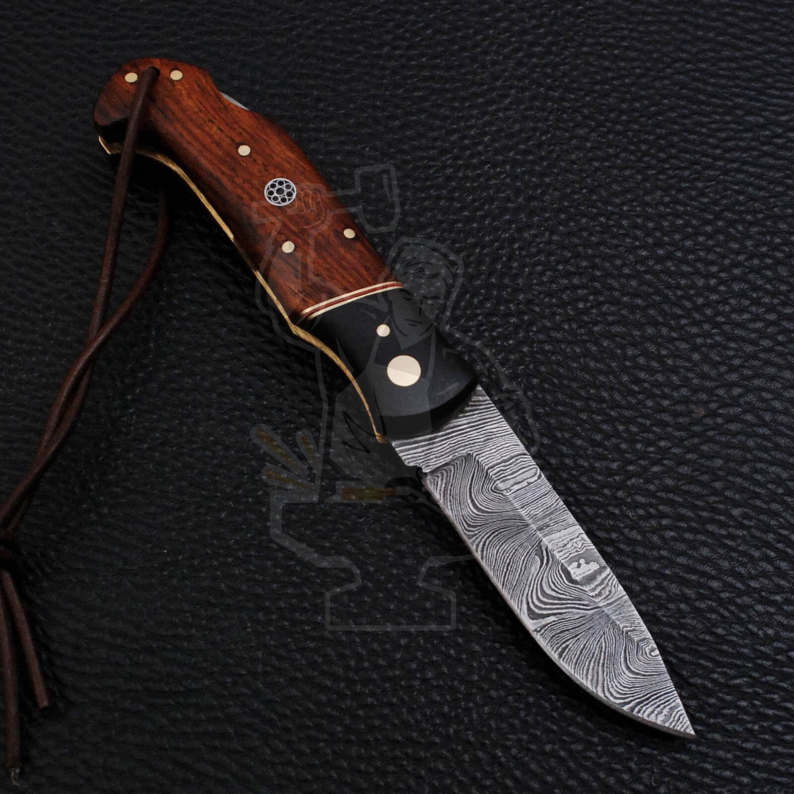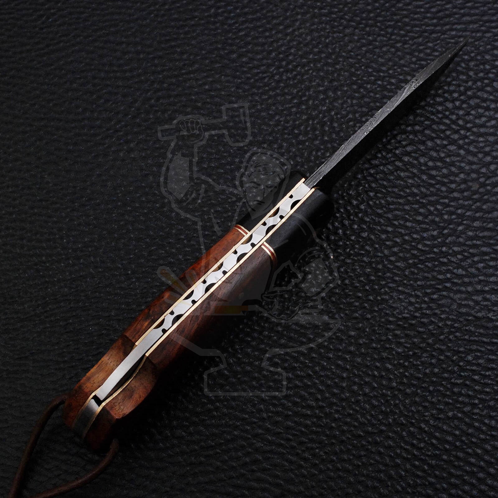 – Rose Wood Handle + Buffalo Horn Bolsters + Mosaic pin + Brass & Fiber Spacers + Lanyard Hole.