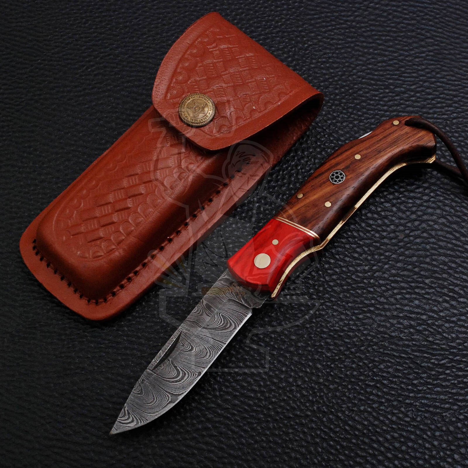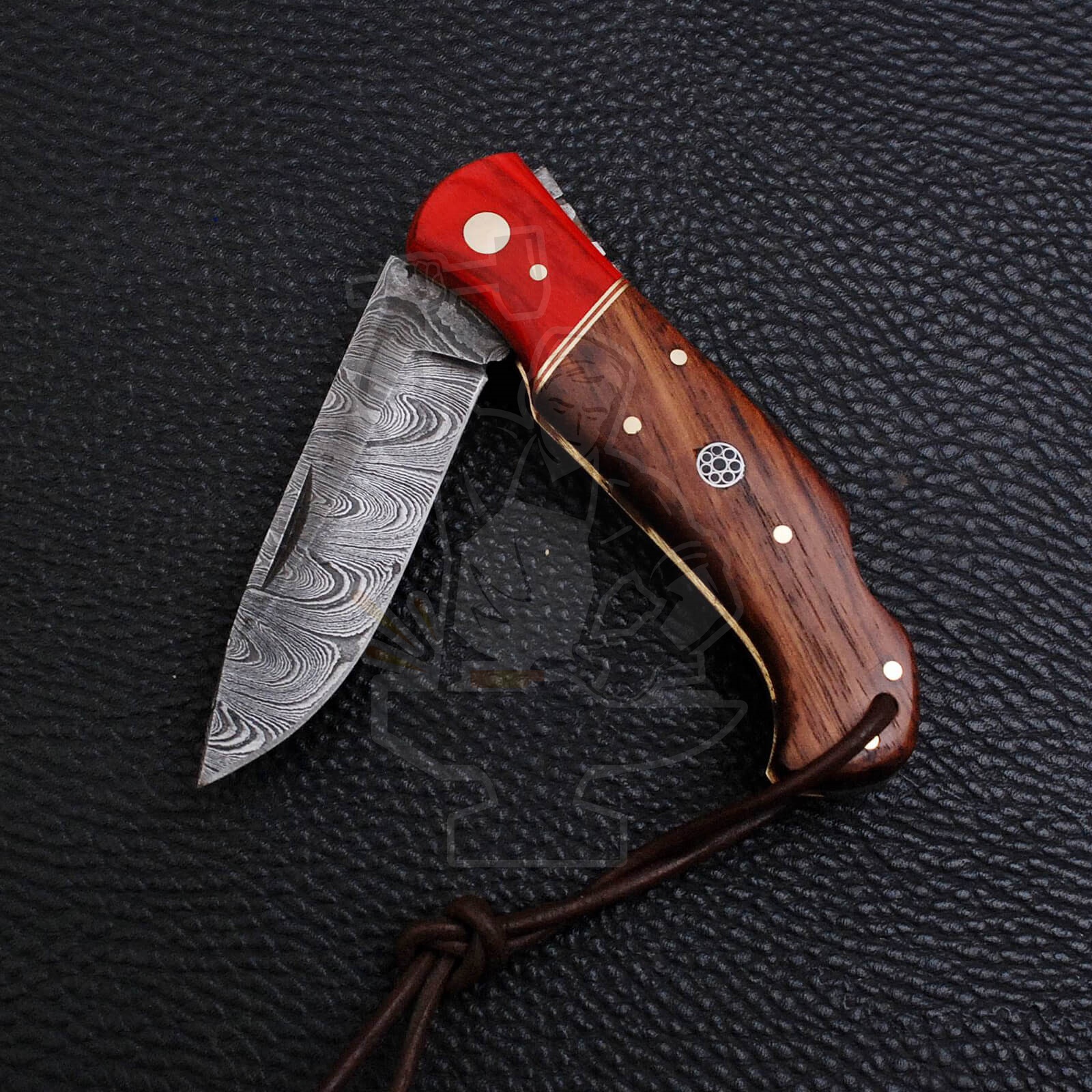 – Rose Wood Handle + Pakka Wood Bolsters + Mosaic pin + Brass & Fiber Spacers + Lanyard Hole.- Traditional Pocket Folding Knife