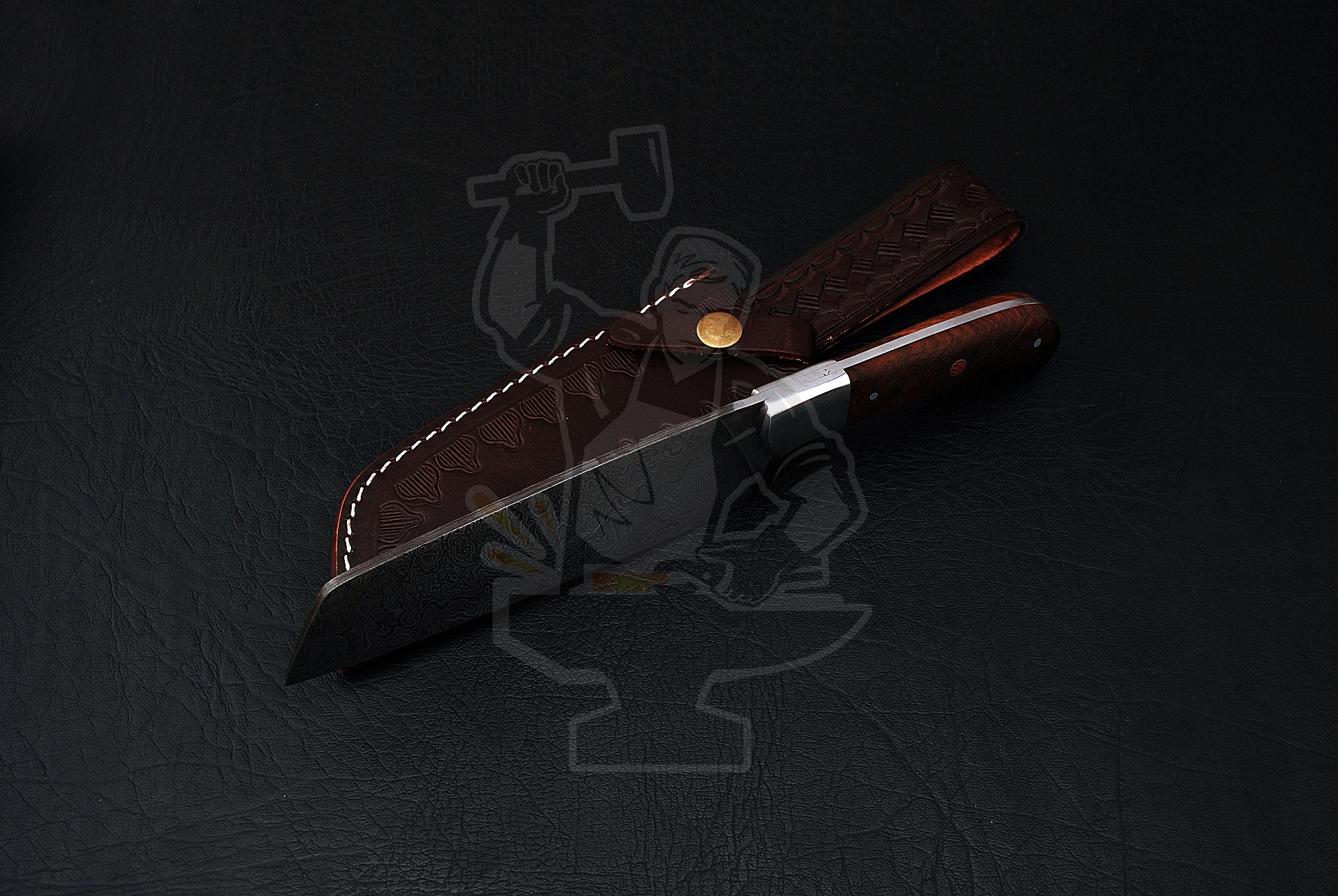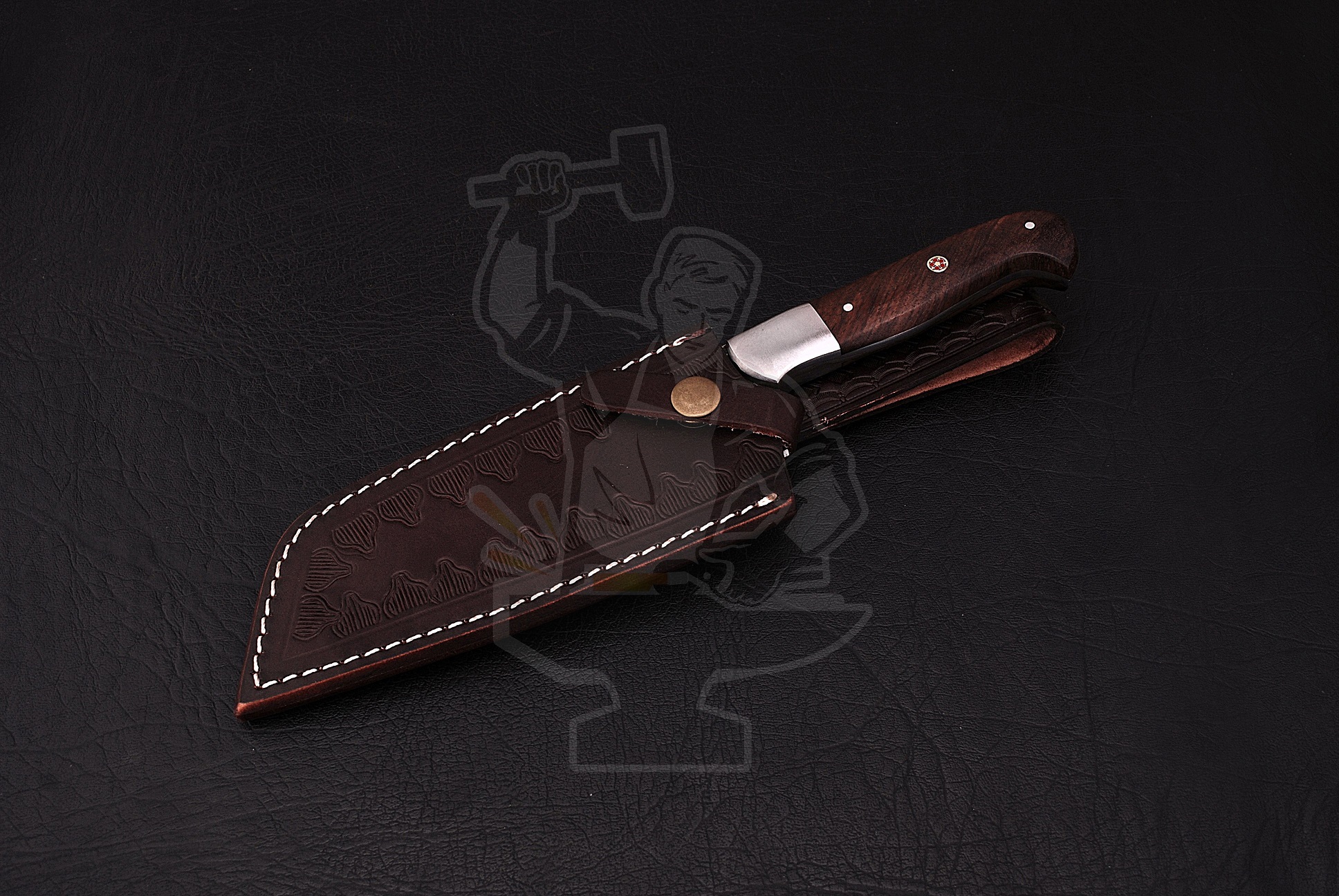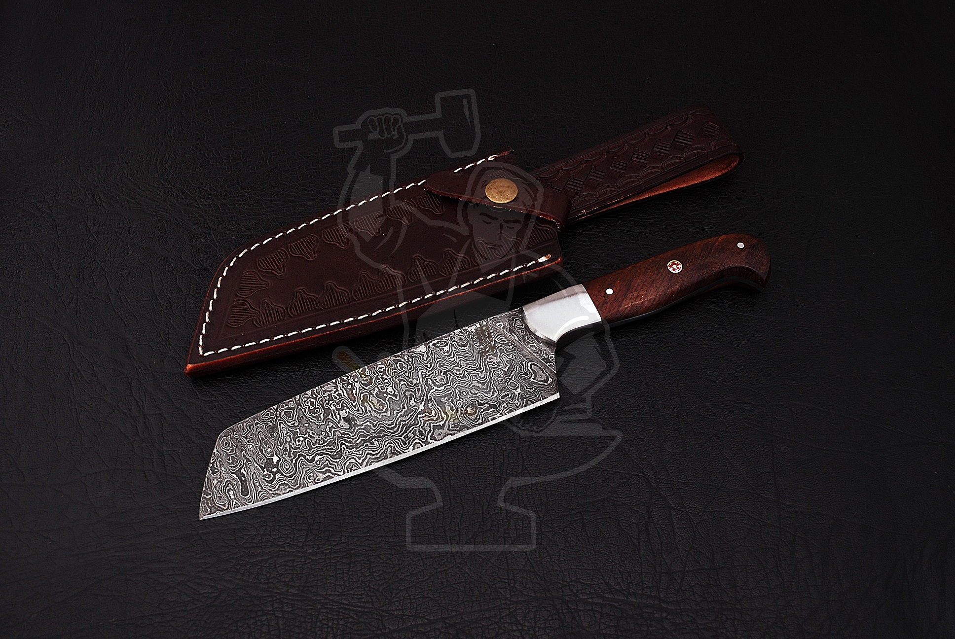 - DAMASCUS STEEL BLADE KICTHEN knife,STEEL BOLSTER,ROSE WOOD WITH MOSAIC PIN handle, GENUINE LEATHER SHEATH.