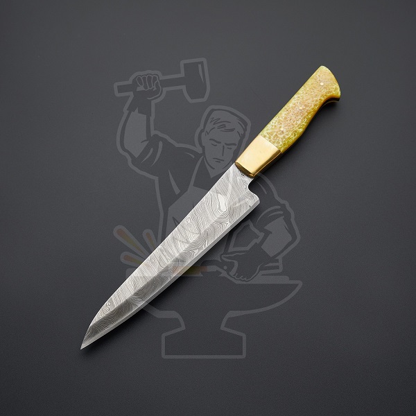 - DAMASCUS STEEL BLADE KITCHEN/CHEF knife, ACRYLIC RESIN handle, BRASS BOLSTER GENUINE LEATHER SHEATH.