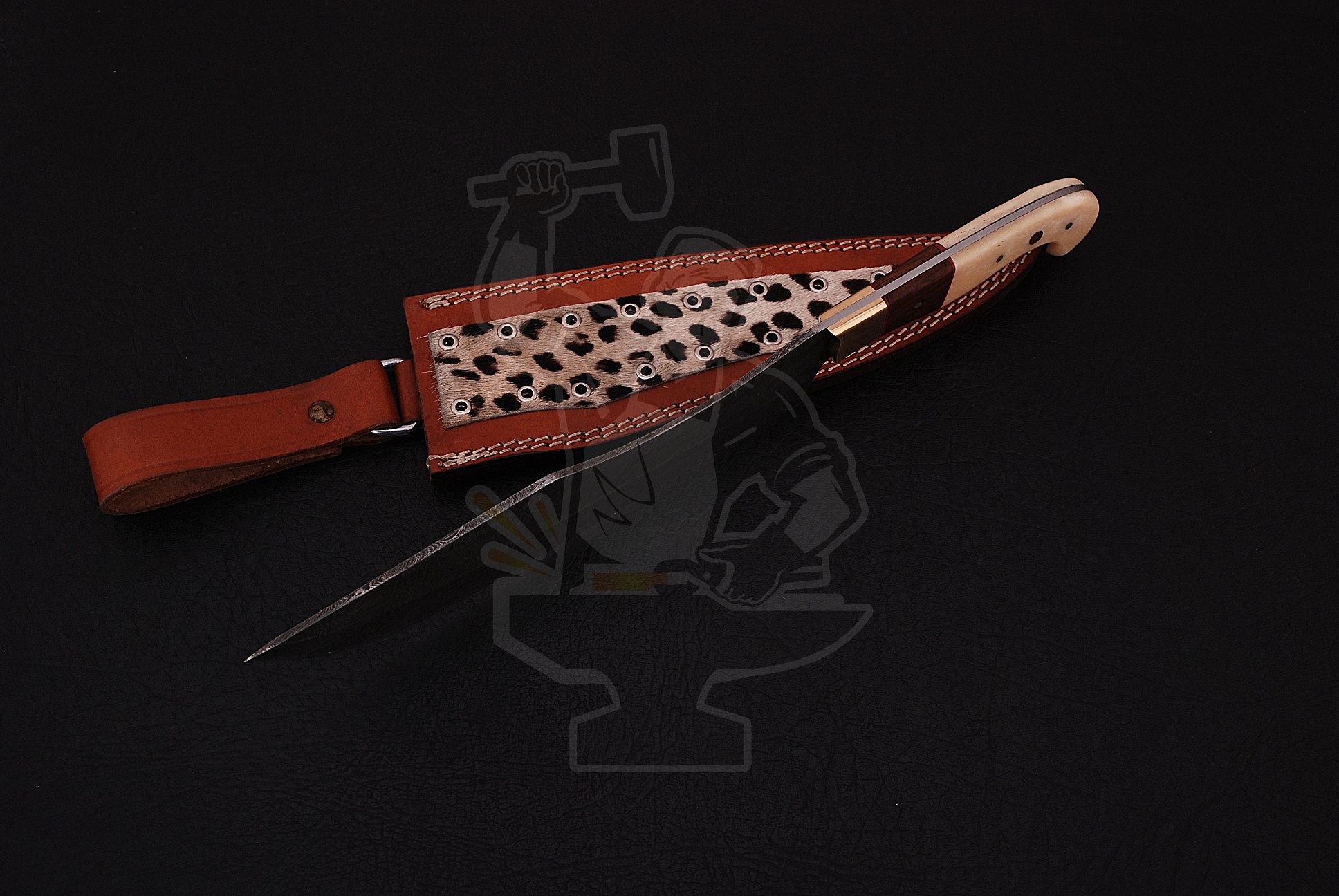 - HANDLE: BRASS BOLSTER,ROSE WOOD + SMOOTH BONE WITH MOSAIC PINS & RED FIBRE SPACERS