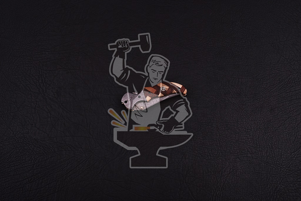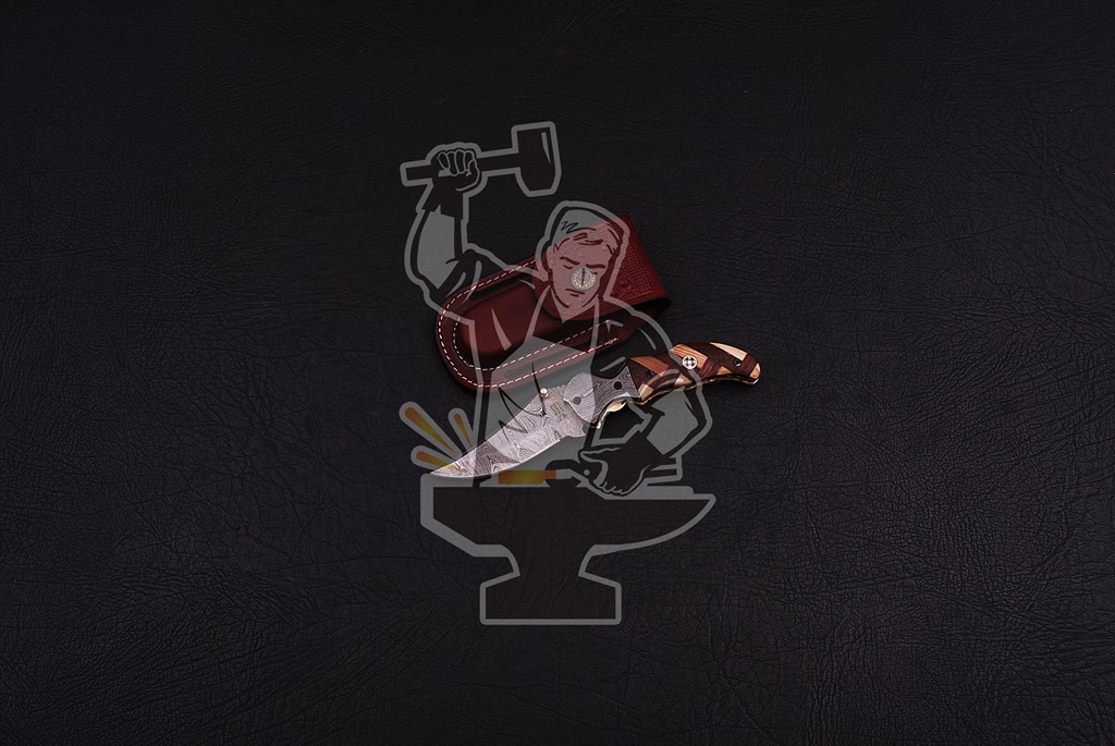 DAMASCUS STEEL CLIP POINT BLADE POCKET,FOLDING LINER LOCK KNIFE,DAMASCUS BOLSTERS ,DECORATED HANDLE OF WALNUT WOOD WITH OLIVE WOOD & MOSAIC PIN INSERTED HANDLE. FILE WORKED BRASS LINERS & COPPER LEVER. , WITH GENUINE LEATHER SHEATH WITH BELT LOOP.