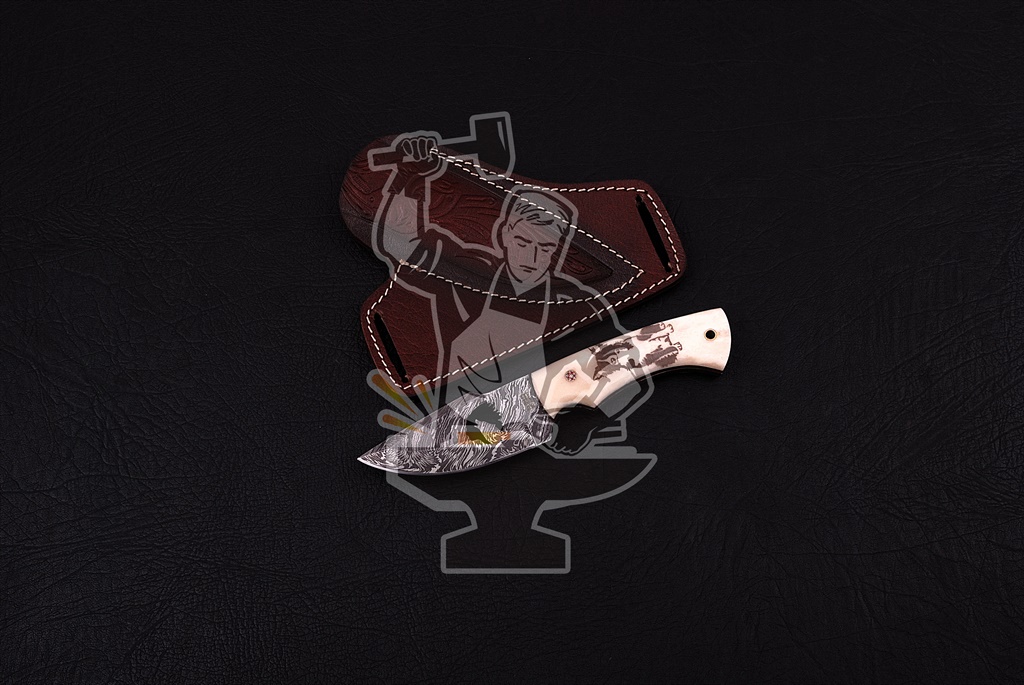 DAMASCUS STEEL FULL TANG BLADE SKINNER KNIFE,ENGRAVED SMOOTH BONE WITH MOSAIC PIN INSERTED & LANYARD HOLE HANDLE , WITH GENUINE LEATHER POUCH WITH BELT LOOP.