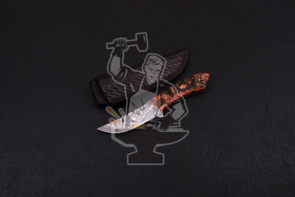 DAMASCUS STEEL BLADE FULL TANG SKINNER KNIFE, ACRYLIC HANDLE, WITH GENUINE LEATHER SHEATH WITH BELT LOOP