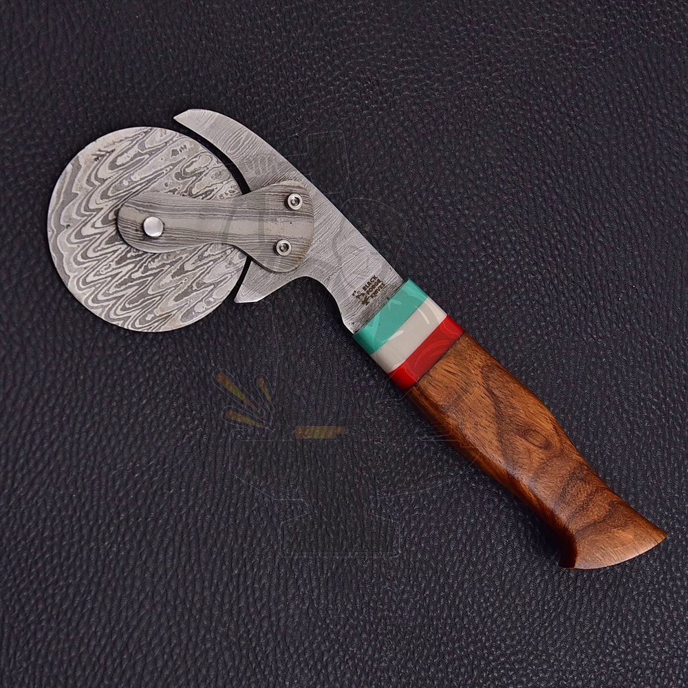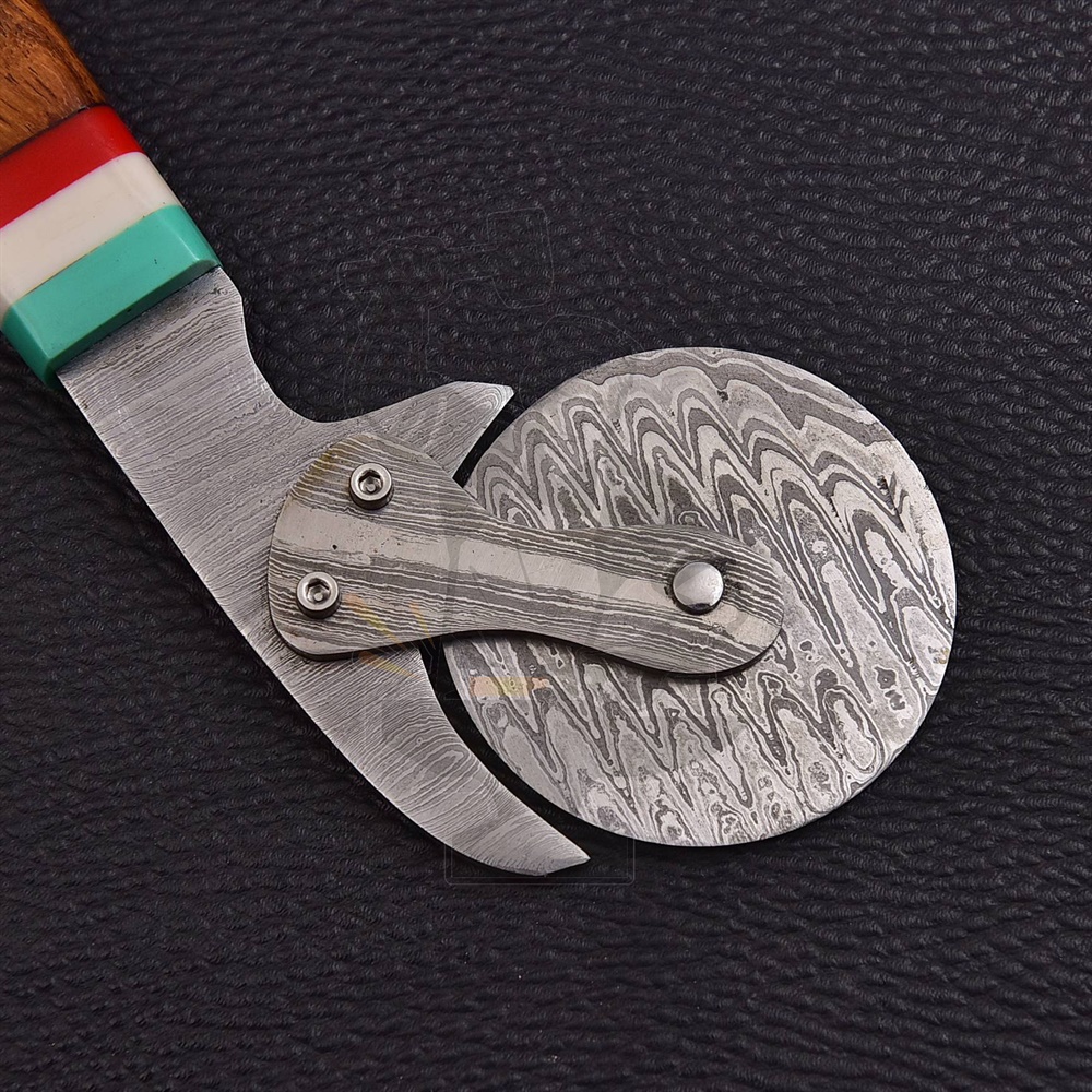 Damascus Chef/Kitchen knivesDamascus Steel Pizza Cutter — Damascus Chef/Kitchen knives. Damascus Steel Pizza Cutter- Damascus Steel Wheel & base • Overall Length: 9″ • Wheel Diameter:2.5″