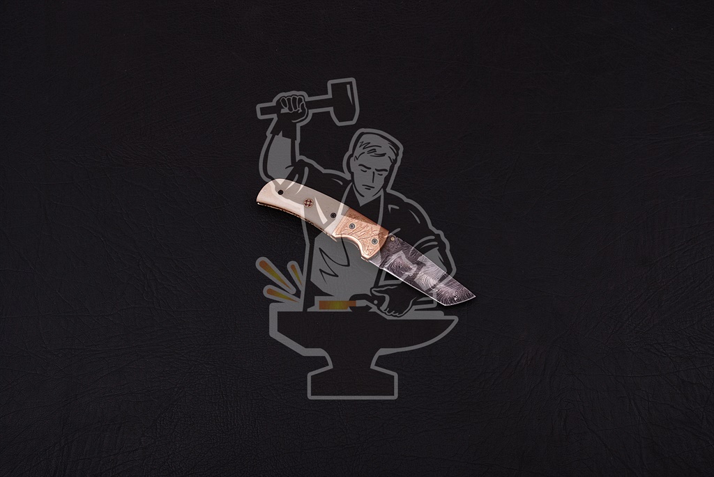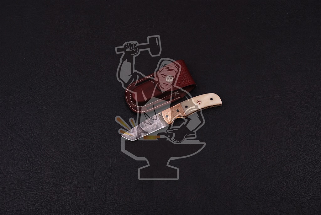 DAMASCUS STEEL TANTO BLADE POCKET,FOLDING LINER LOCK KNIFE,HAND ENGRAVED COPPER BOLSTER WITH SMOOTH BONE & MOSAIC PIN INSERTED HANDLE. FILE WORKED BRASS LINERS & COPPER LEVER. , WITH GENUINE LEATHER SHEATH WITH BELT LOOP.
