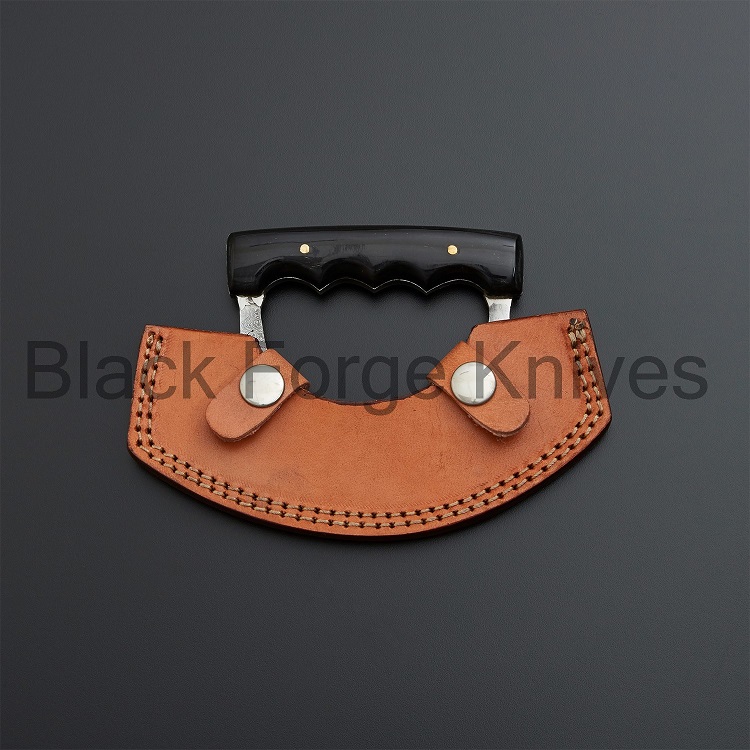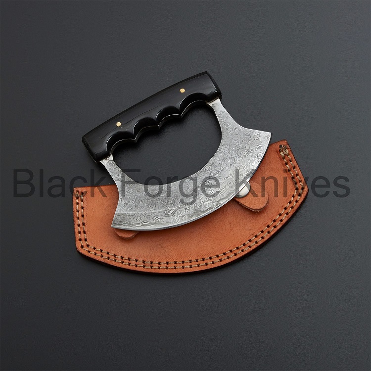 - DAMASCUS STEEL BLADE Ulu knife, Black Micarta HANDLE, GENUINE LEATHER SHEATH.