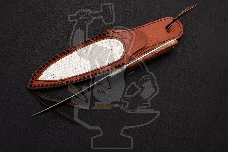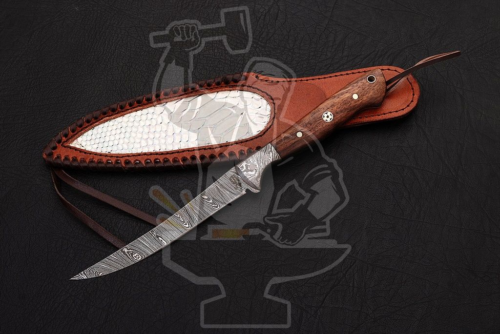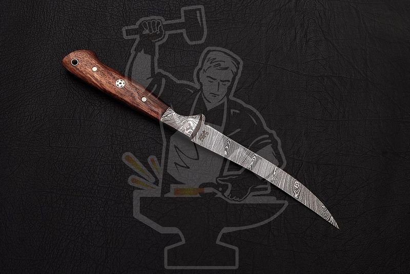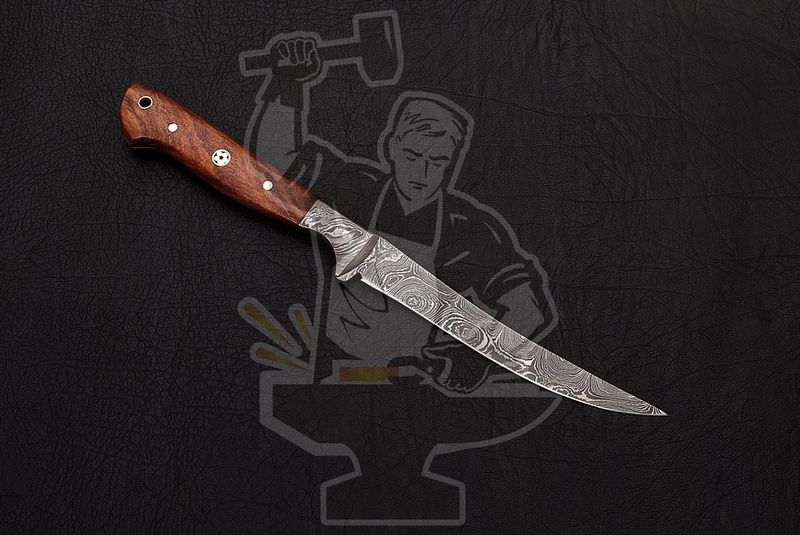Damascus Chef/Kitchen knivesFillet/boning knife — Damascus Chef/Kitchen knives. Damascus Fillet/Boning Knife- Overall Length: 11″ • Blade Length: 5.5″ • Rose Wood Handle With Mosaic Pins & Lanyard Hole