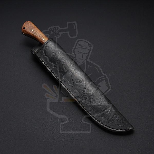 • HIGH CARBON STEEL BLADE KITCHEN/CHEF knife, ROSE WOOD handle, BRASS BOLSTER, GENUINE LEATHER SHEATH.