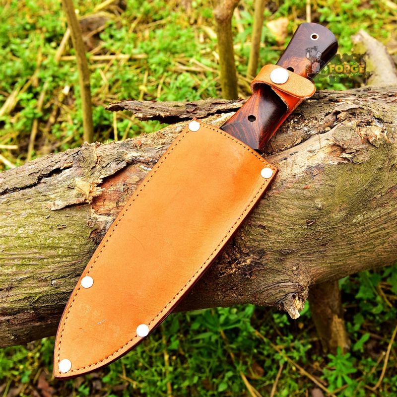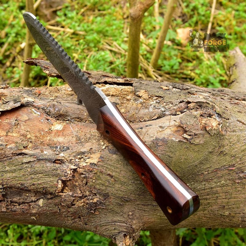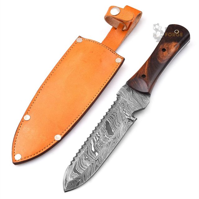 Features a Damascus Steel Blade for digging, beveled sharp edge for slicing, serrated opposite edge for cutting tree limbs