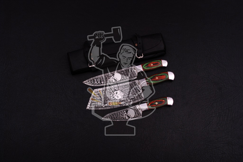 J2 STEEL ETCHED BLADES CHEF/KITCHEN KNIFE SET (3 PIECE SET) STEEL DOUBLE BOLSTERS WITH MULTI COLOR PAKKA WOOD & MOSAIC PINS INSERTED HANDLE WITH LEATHER POUCH