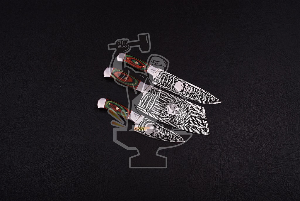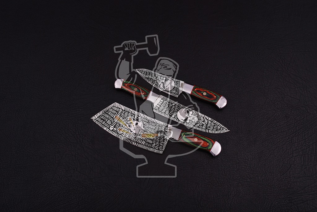 Damascus Kitchen knife SetJ2 STEEL CHEF KNIFE SET (3 PIECE ) — Damascus Kitchen knife Set. 1st Knife ,OVERALL LENGTH: 11.25″INCH:KNIFE BLADE LENGTH 7.00″