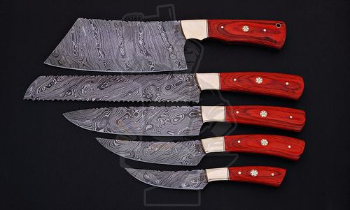 - HANDLES:DAMASCUS STEEL BLADES CHEF/KITCHEN KNIFE (5PCS SET) BRASS BOLSTERS ORANGE COLOR PAKKAWOOD WITH MOSAIC PINS