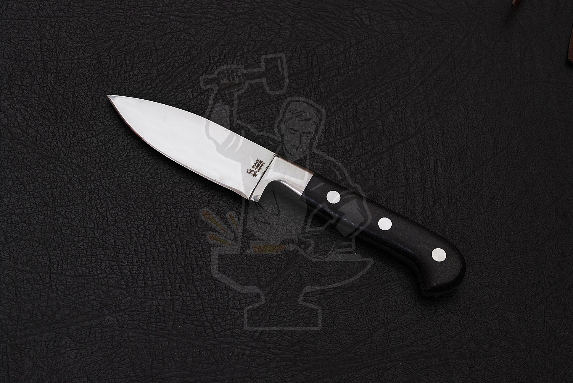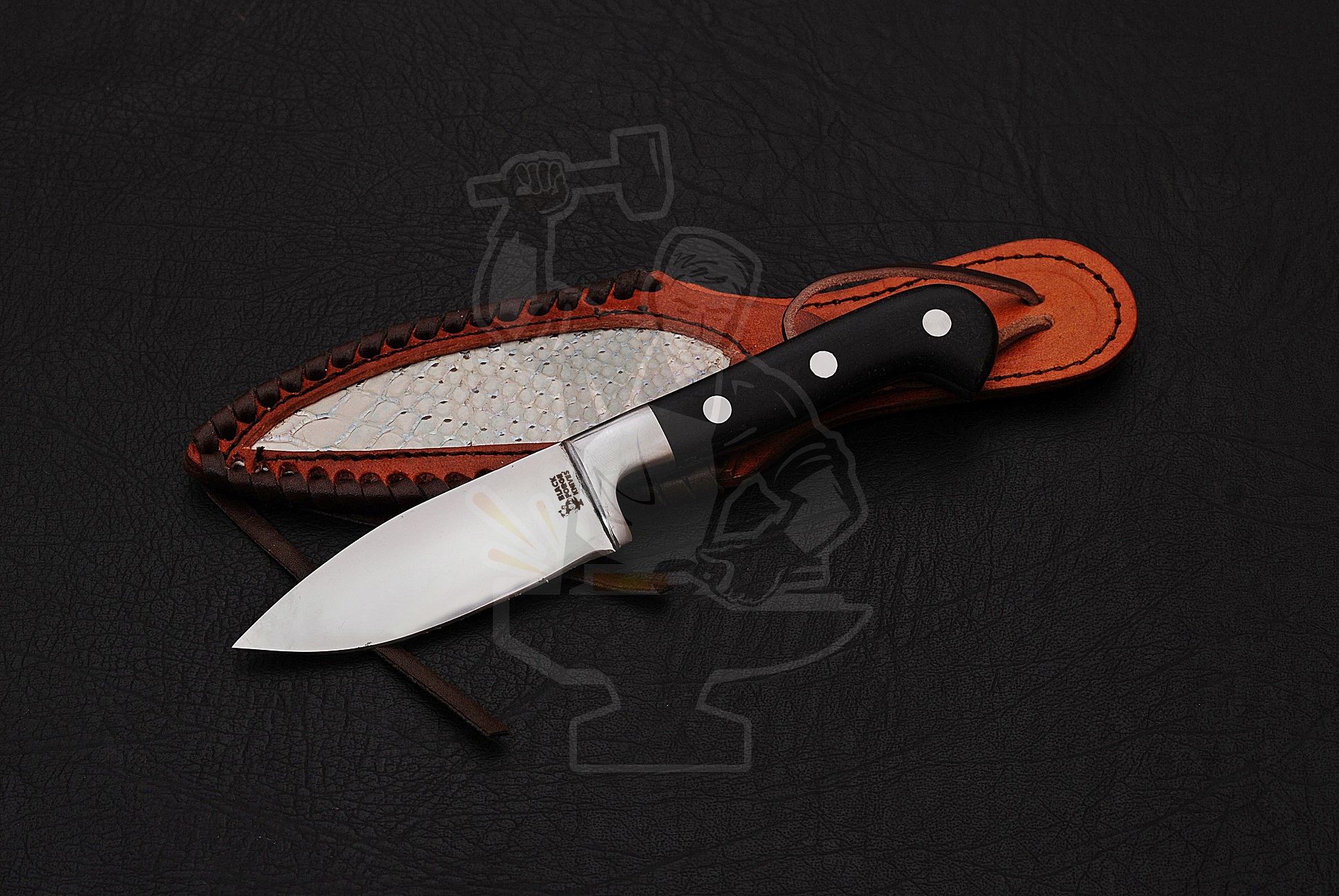 - Stainless steel 440c BLADE CHEF KNIFE, STEEL BOLSTER WITH BLACK MICARTA HANDLE, GENUINE LEATHER SHEATH.
