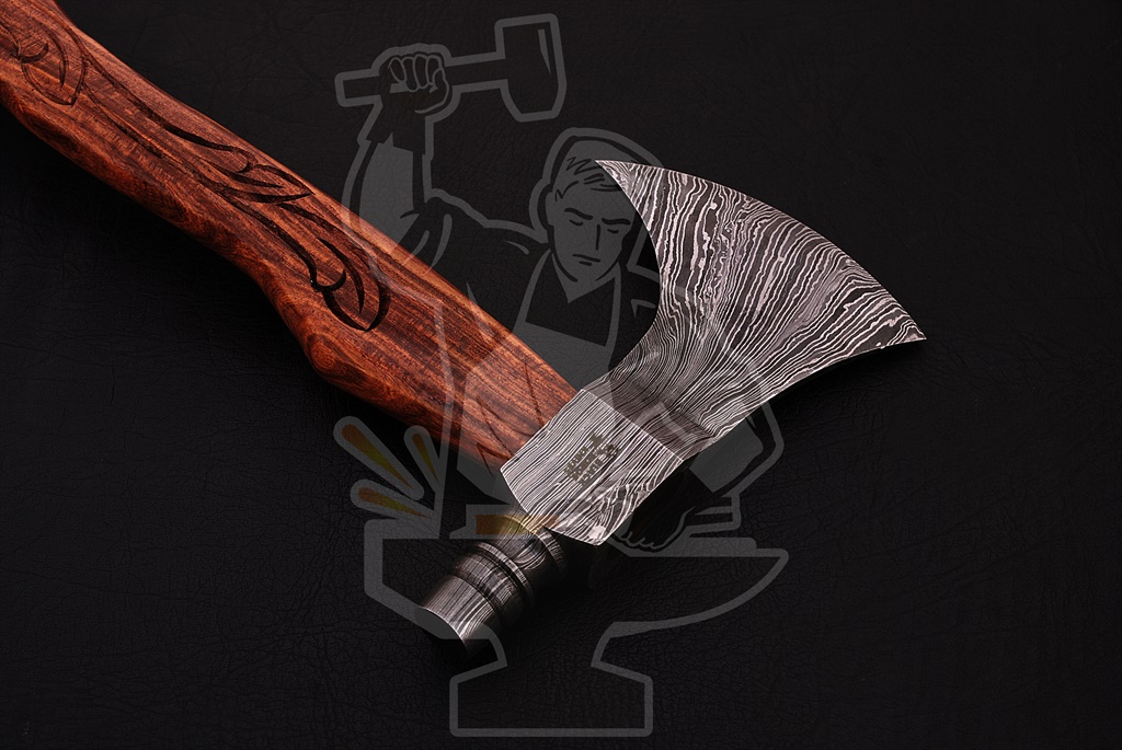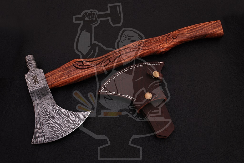 Tomahawks/AXESTOMAHAWK — Tomahawks/AXES. Damascus Steel Tomahawk • Hand Carved Rosewood Handle • Overall Length: 19″